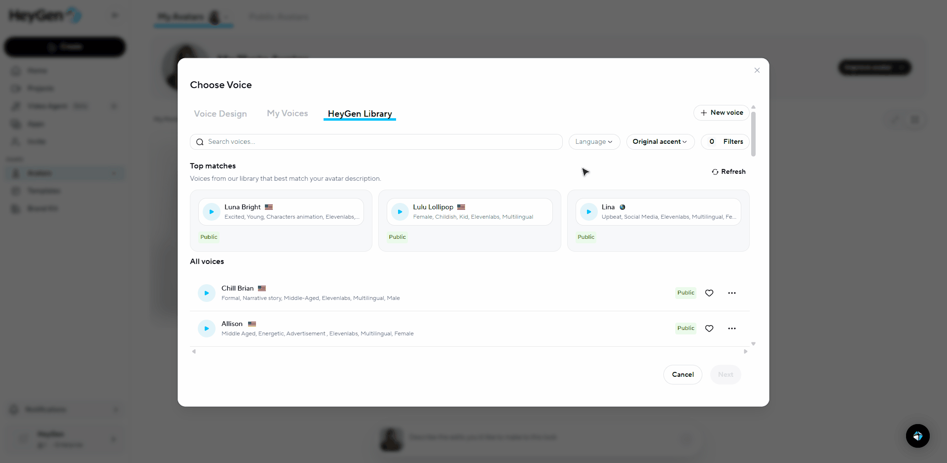 Next, you’ll select a voice for your avatar. HeyGen will recommend voices based on your avatar’s profile, but you can create a new voice, or browse and search the full voice library to find the one that best fits your style and tone. If you’d like a deeper walkthrough, check out our guide on using HeyGen AI Voice for high-quality video narration.