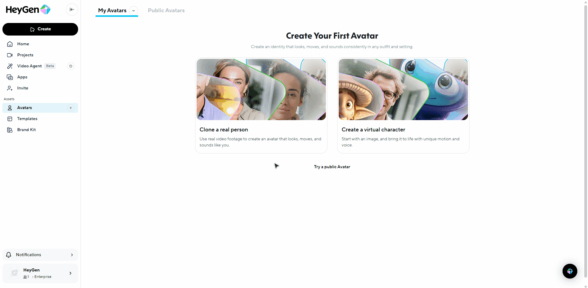 To start, log in to your HeyGen account and click ‘Avatars’ on the Left side of the screen.