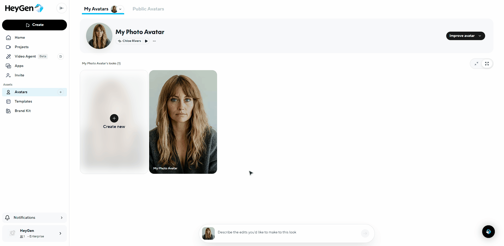 You can generate different Looks for your avatar directly from the Avatars tab. Simply enter a short description of how you want your avatar to appear, and HeyGen will generate a new version of your avatar in that setting.