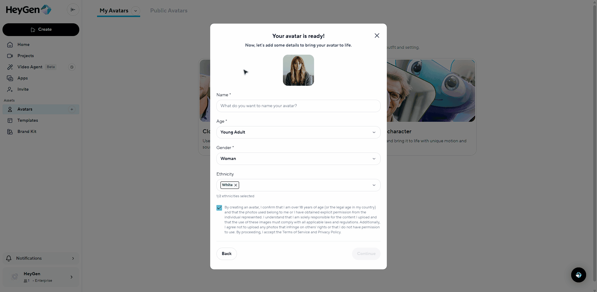 After your images are uploaded, you’ll be prompted to enter your avatar’s details, including name, age, gender, and race. Fill in this information to help HeyGen generate a more accurate and consistent character.