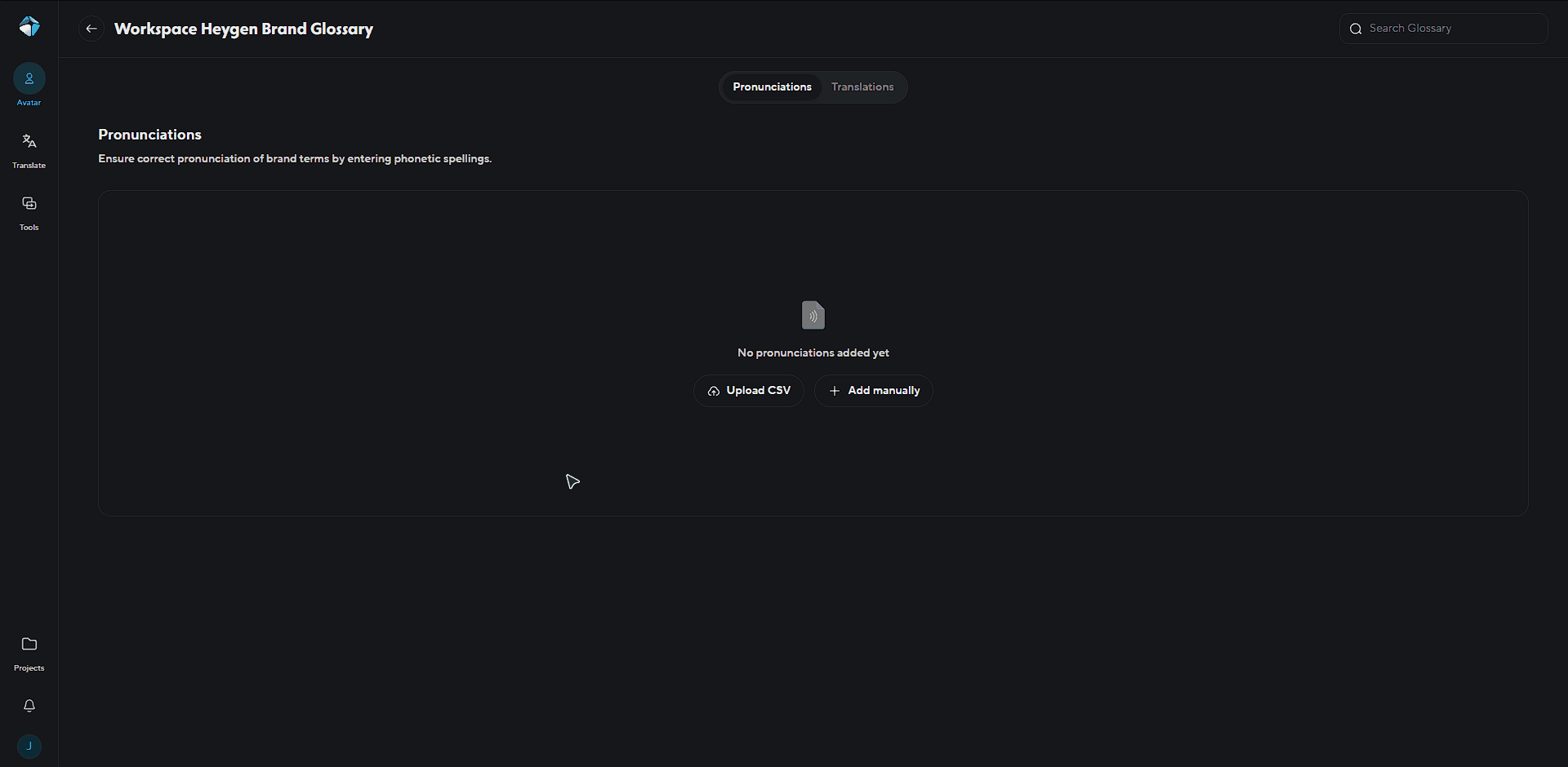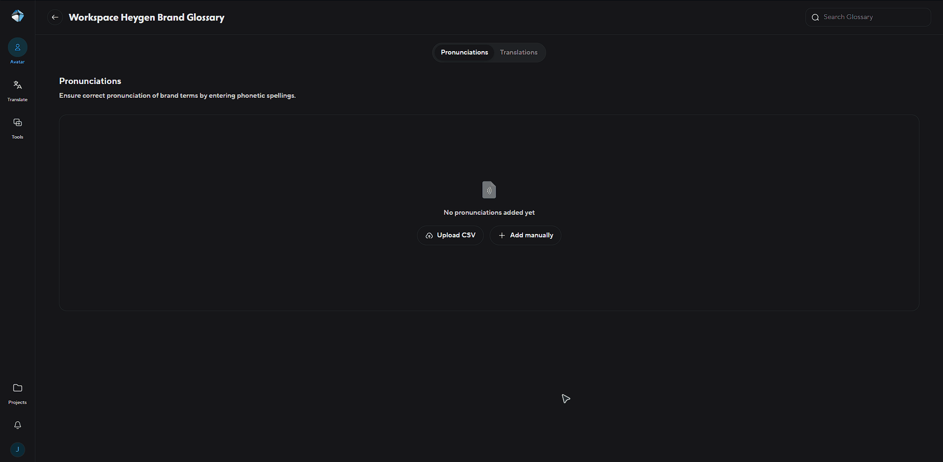 From the brand kit page Click the "Create Brand Glossary" button to start a new collection of pronunciations.