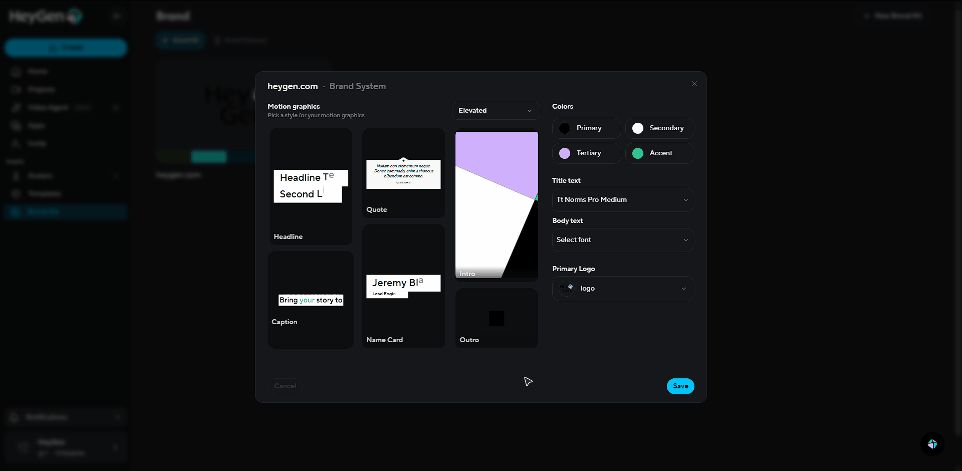 Once finished, you will see that you can edit your brand system, this is a series of animations and graphics that you will be able to use within your videos, already matched to you brands colors, logo, and fonts.