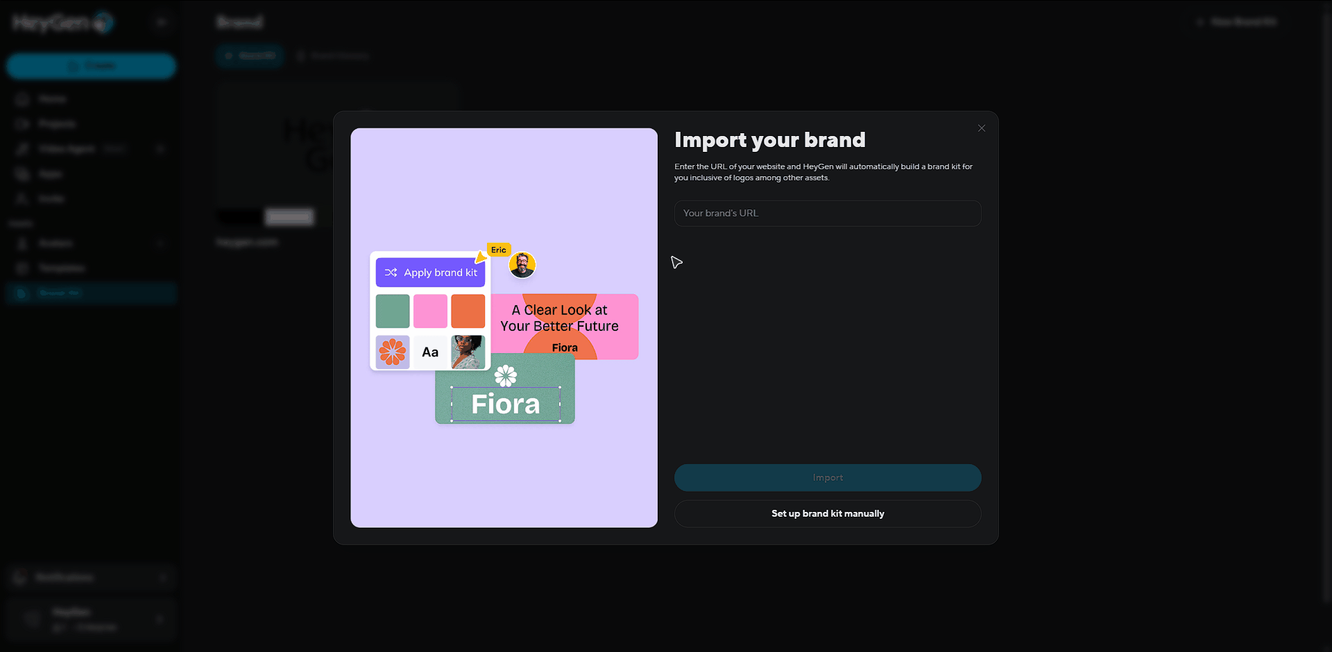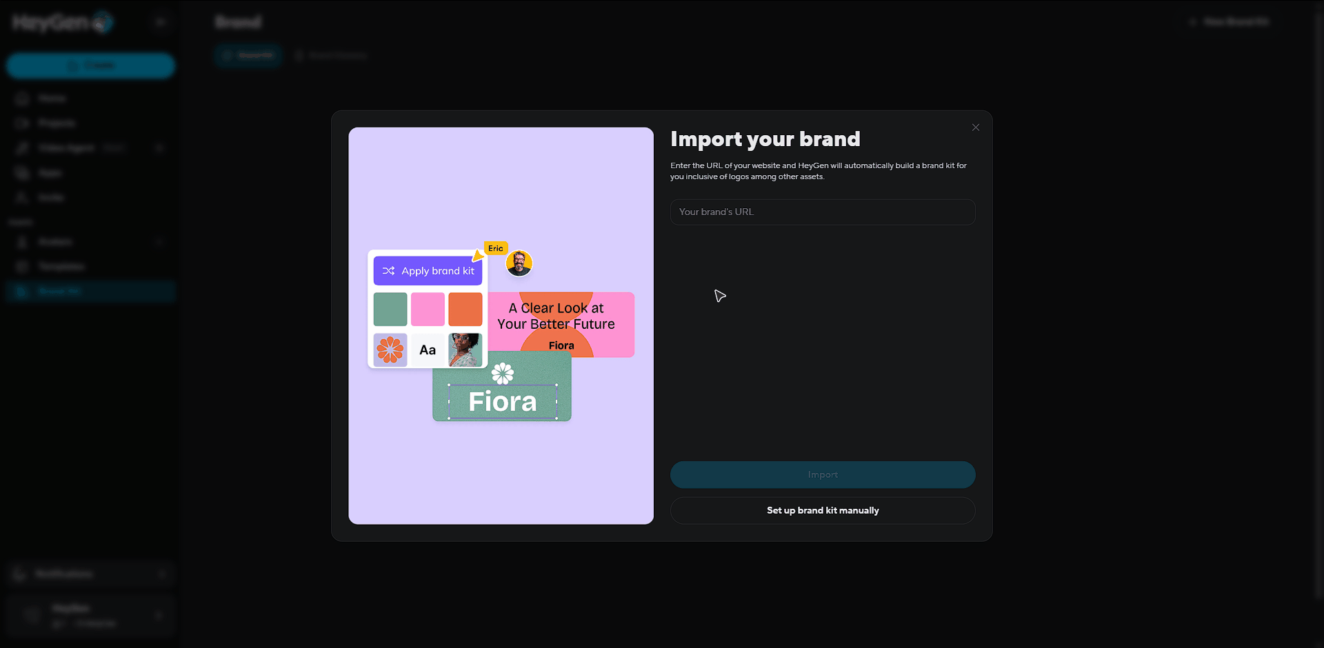 By selecting this option, HeyGen will automatically extract logos, colors, photos, fonts, and videos from your website to create a complete Brand Kit. If you need to make any adjustments to the elements, you can easily do so after the Brand Kit is created.