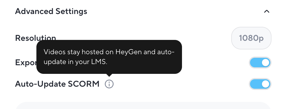 SCORM (Sharable Content Object Reference Model) is a widely used standard for e-learning content in Learning Management Systems (LMS). HeyGen’s SCORM Export feature allows you to create SCORM-compliant packages from your videos, making it easy to track learner progress within an LMS.