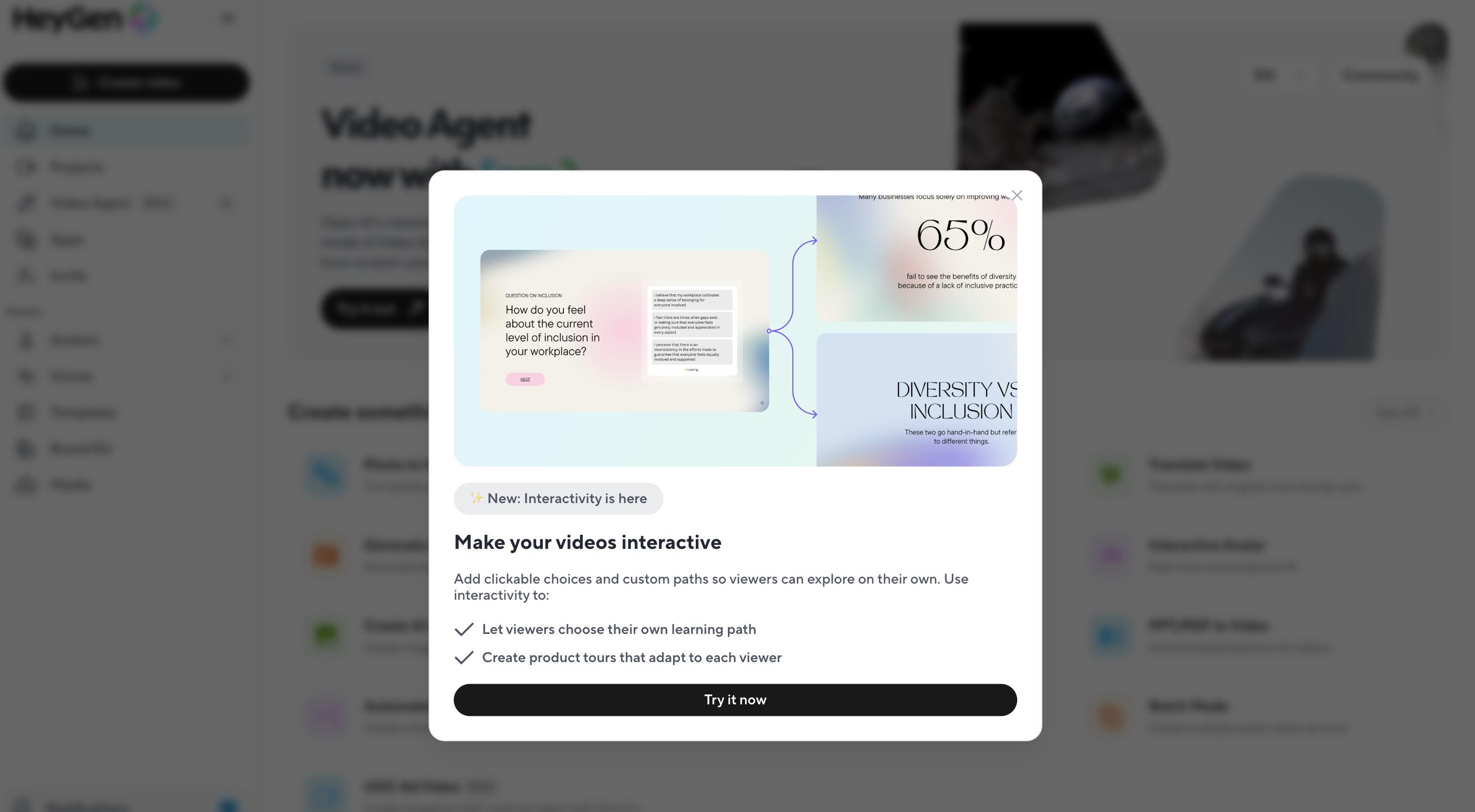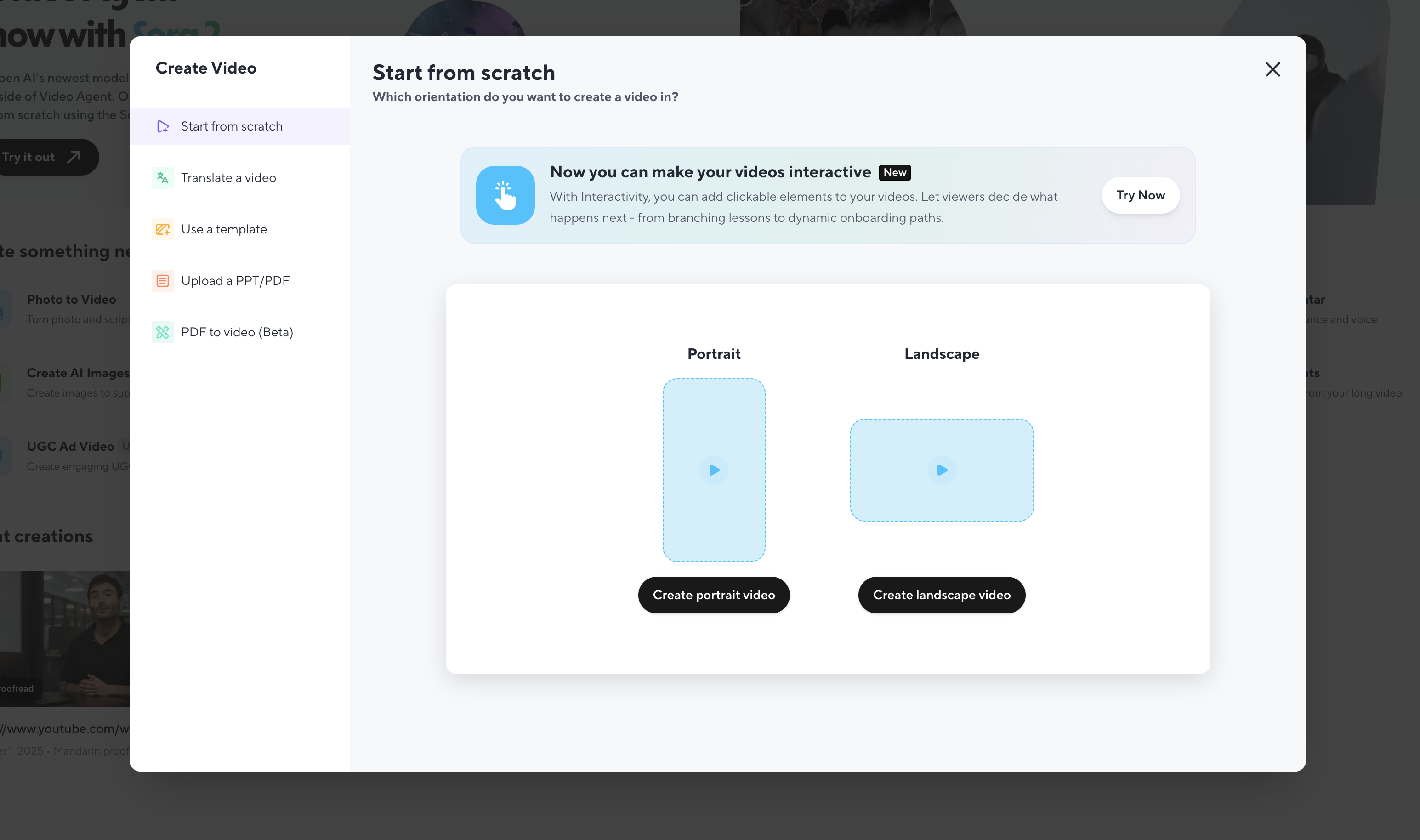Click 'Create Video' from your dashboard, then click 'Try Now' when prompted to make your video interactive.