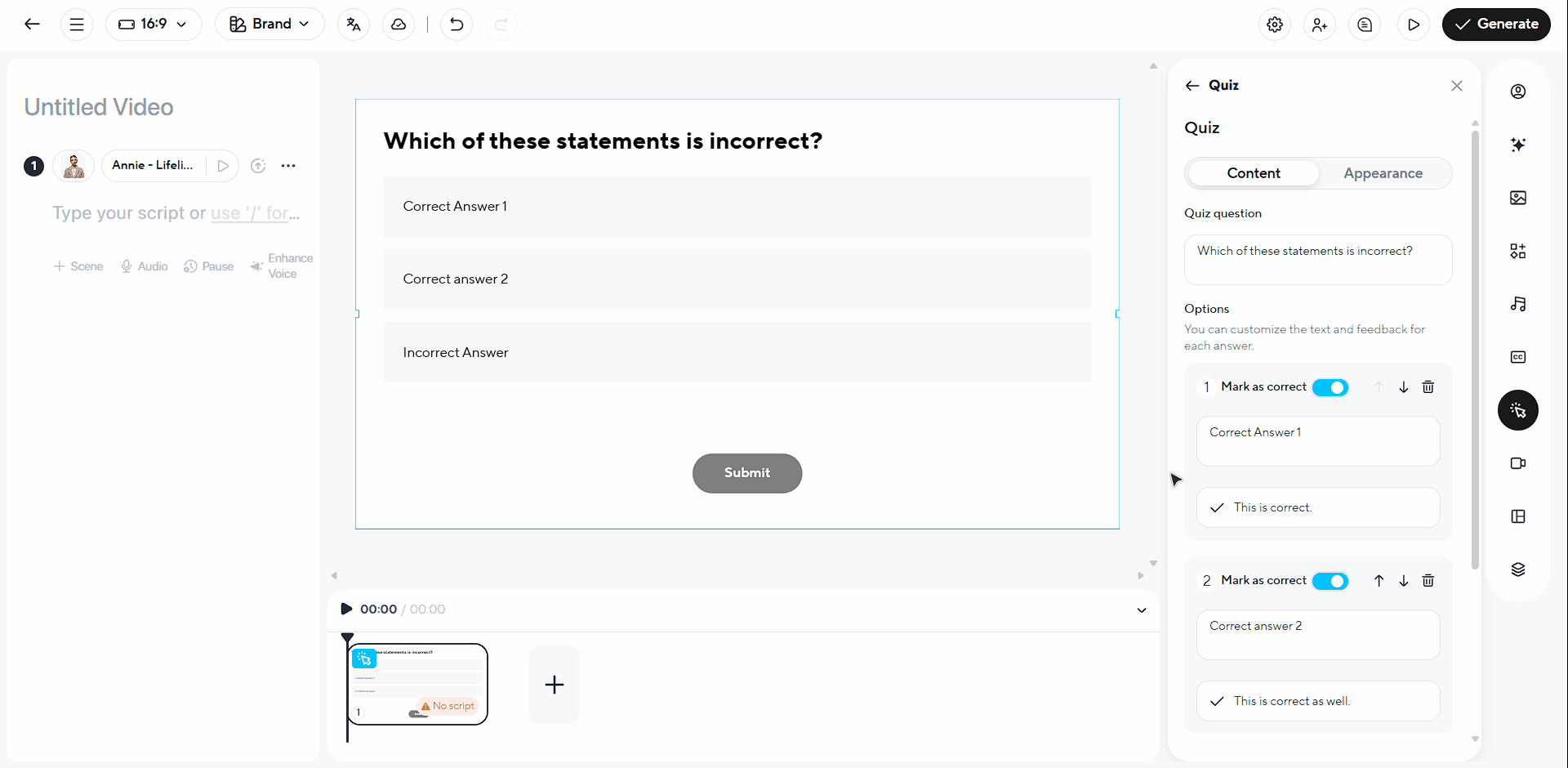 To use a quiz, select Quiz from the interactivity menu and update the question text in the Content tab. You can add or remove answer options as needed and mark which answers are correct.