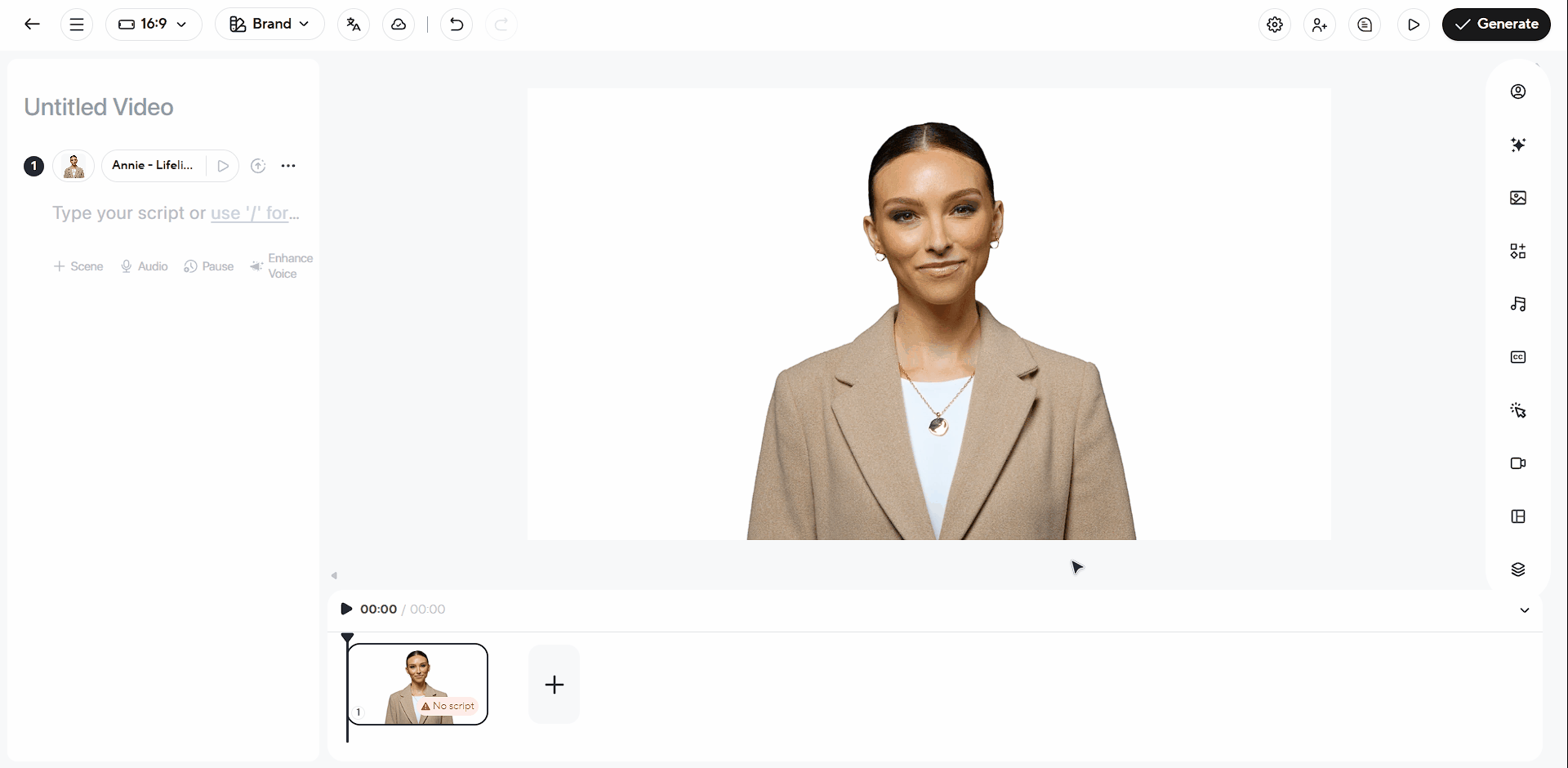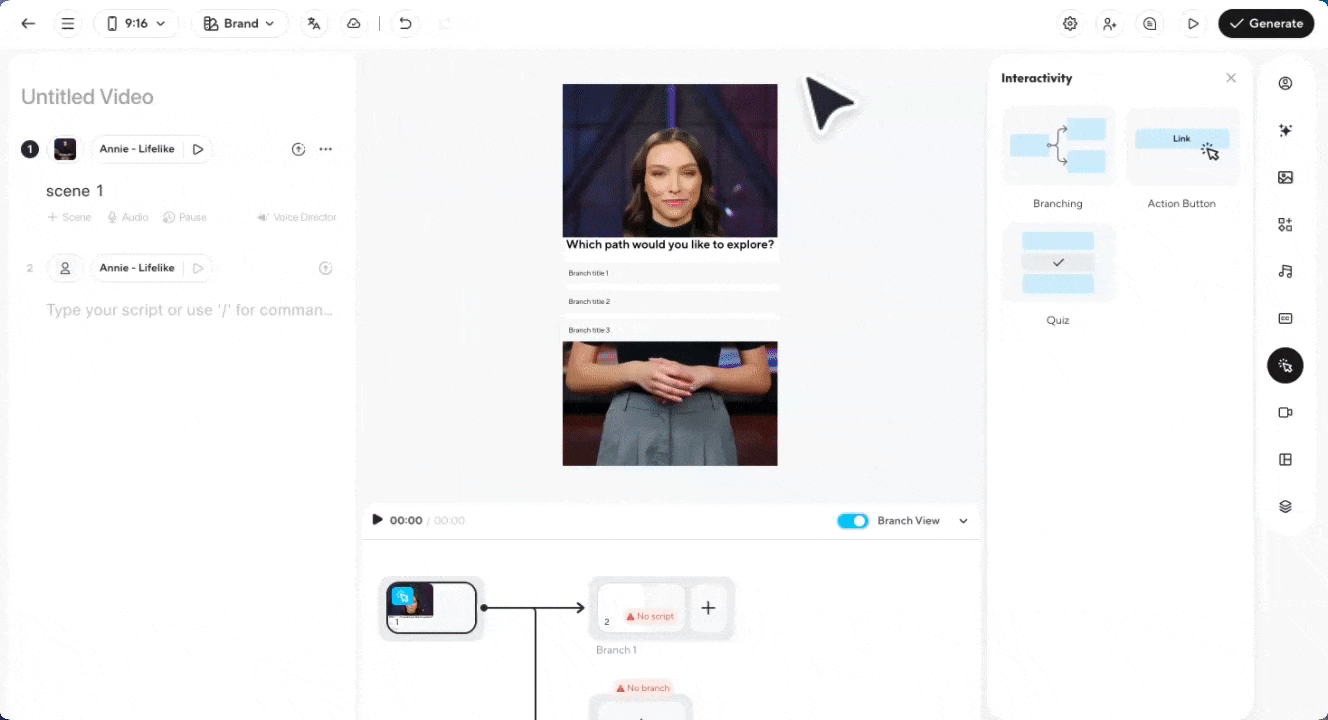 As an L&D user, you have access to interactivity options directly within the editor, allowing you to build decision points, assessments, and navigation paths inside your video.