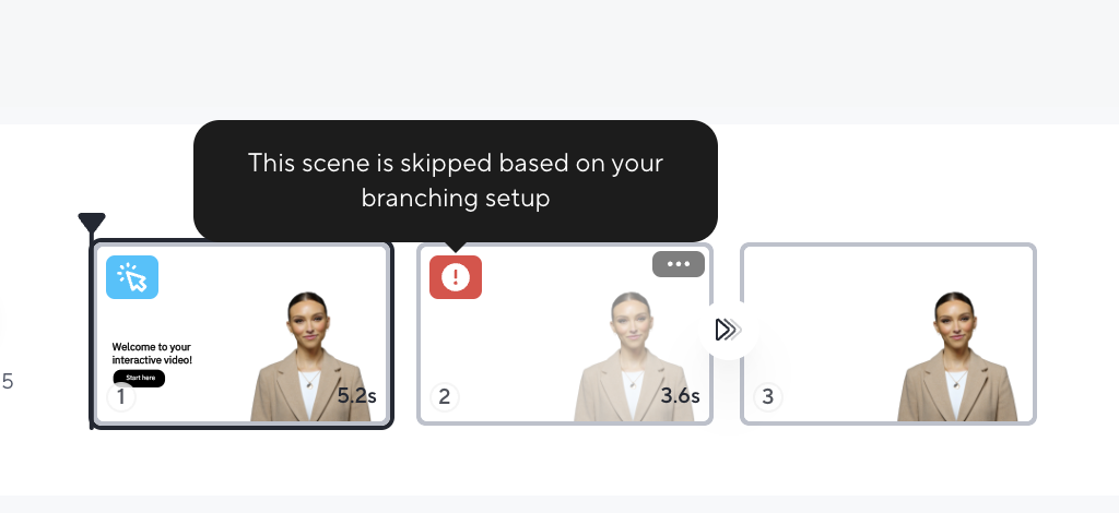 To help you spot scenes that may be skipped due to branching, HeyGen will flag them directly in the scene viewer with a red indicator.